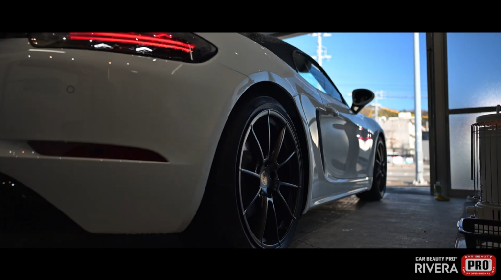 安定した室内照明に、あえて「戦略的な1灯」を追加。照明は画質だけでなく、コーティングされた車両の光沢や作業場のリアリティを劇的に向上させます。