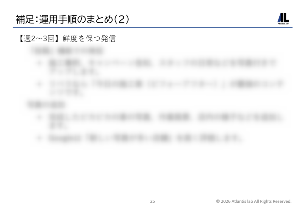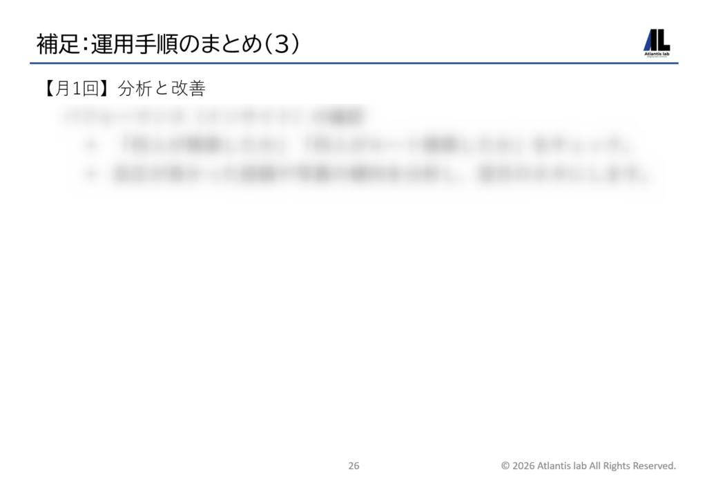 アトランティスラボが目指すのは、一過性の改善ではなく「継続可能な内製化」です。コンテンツSEOやSNS更新など、多忙な現場での負担を考慮し、重要度の高い項目に絞り込んだ「高効率な運用スキーム」を設計しました。