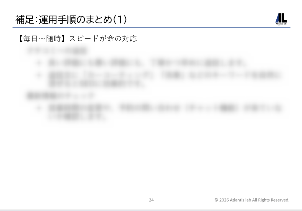特に重要度の高い項目については、最初の3ヶ月間を弊社が重点的にバックアップ。操作に慣れ、運用のリズムが掴めるまで手厚くサポートすることで、スムーズな内製化への移行を実現します。